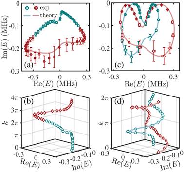 Figure 3. The unknot (a, b) and Hopf link (c, d) structures of complex eigenenergies.