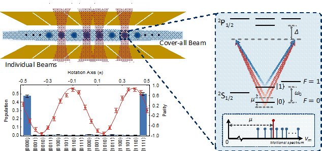 In this letter, prof. Kim’s group reported the realization of scalable, more than two-qubit gates in a trapped ion system. Trapped ion system is one of the strong leading candidates for the implementation of practical quantum computers. Recently a blue-print of a trapped ion system scalable up to a few dozens of qubits in a single trap has been proposed and a small programmable quantum computer has been realized following the blue-print. Until now, all the operations in such scalable trapped ion system are based on single qubit and two-qubit gates. The research grouped develop the novel scheme of more than two-qubit gates and experimentally demonstrate the global gates up to 4-qubits as an example. They benchmarked the performance of the operation by observing the fidelity of Bell-state, which is significantly larger than classical bounds.