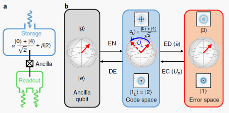 Due to the fragile nature of quantum information, QEC against unwanted errors is necessary and has long been considered as the holy grail of fault-tolerant quantum computing. Different from the challenging standard QEC schemes based on multiple physical qubits, the group at CQI of Tsinghua University uses a hybrid system consisting of a superconducting qubit and a bosonic microwave cavity. Quantum information is encoded on superpositions of photon Fock states in the cavity with carefully chosen binomial coefficients, which can correct single photon losses, the dominant error channel of this system. This QEC scheme benefits from the infinite dimensional Hilbert space of the cavity for redundant information encoding without increasing the number of error channels, thus greatly reduces the hardware requirement.