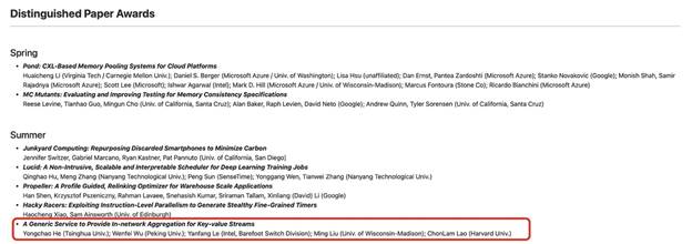 博士生何永超发表的第一作者论文《A Generic Service to Provide In-network Aggregation for Key-value Streams》荣获会议杰出论文奖(Distinguished Paper Award)。论文其他作者包括吴文斐(北京大学)、乐燕芳(英特尔)、刘铭(威斯康星大学-麦迪逊分校)、刘俊林(哈佛大学)。