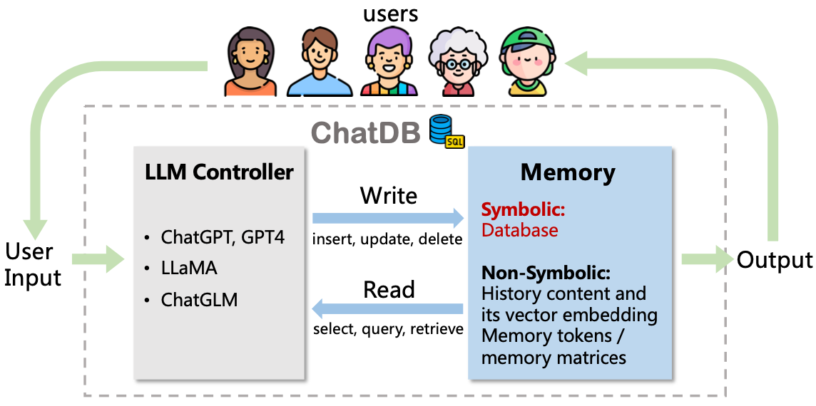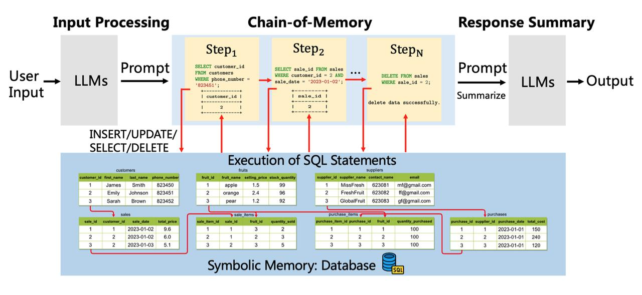 交叉信息院赵行研究组及其合作单位的研究者们提出一种新型符号性记忆框架ChatDB,突破了此前常用的记忆框架中对储存信息操作不精确、历史信息储存形式缺乏结构性等局限。该论文《ChatDB: Augmenting LLMs with Databases as Their Symbolic Memory (ChatDB:用数据库作为符号性记忆模块来增强大语言模型)》发布于康奈尔大学ArXiv,并在Twitter上被Elvis Saravia等知名机器学习和自然语言处理研究者转发。