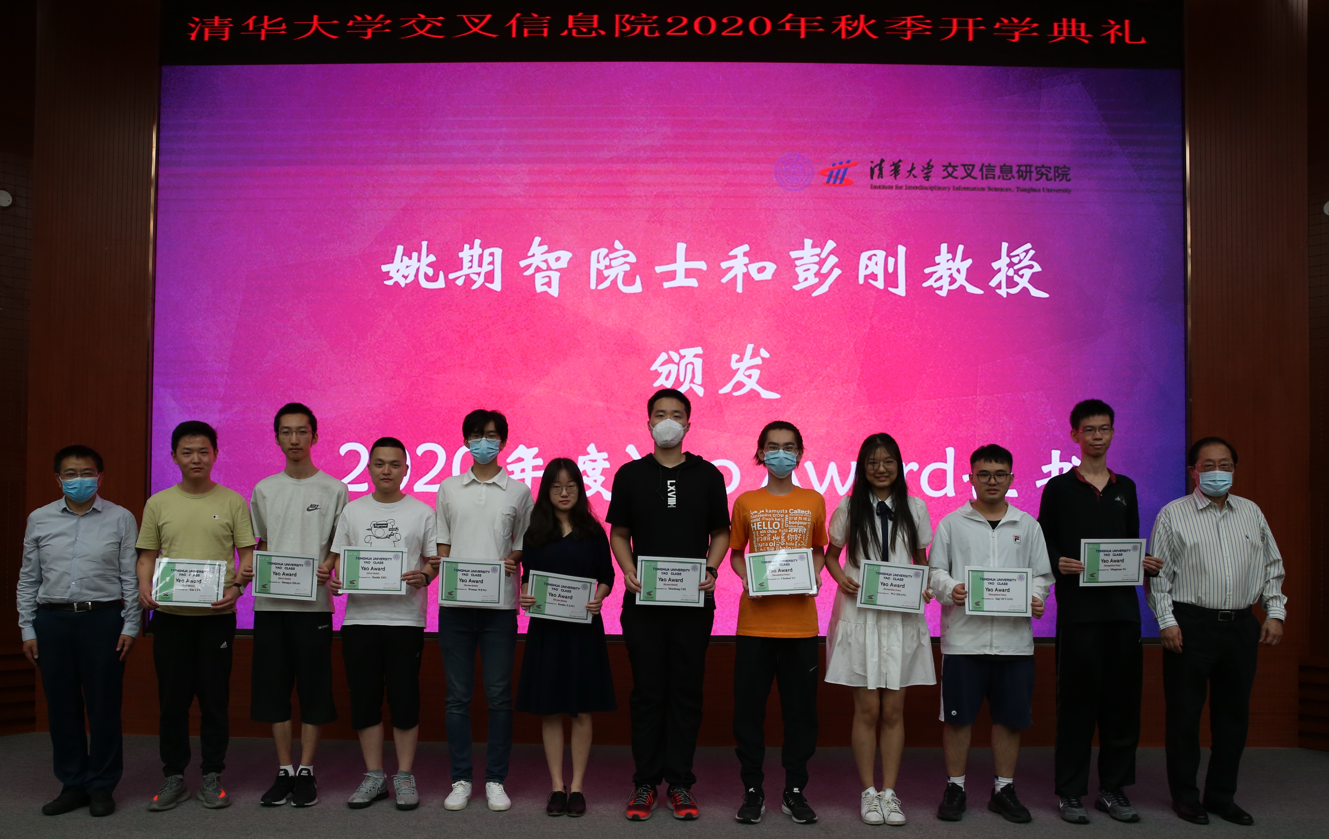 开学典礼上,姚期智院士和彭刚教授还共同颁发了2020年度 Yao Award奖学金。该奖项由姚先生专门设立,用于奖励本科阶段在学习和科研上取得优异成绩和突出成果的年轻学子。本年度来自计科70班的12名同学获颁证书。Yao Award 获奖代表吕欣简述在姚班三年里经历的有趣课程并分享了姚班培养方案在教学内容方面的先进性,特别感谢姚班提供的丰富学术资源,这其中以志同道合的同学们、博学多闻的老师们、以及扎根于各行各业的校友们最为珍贵。