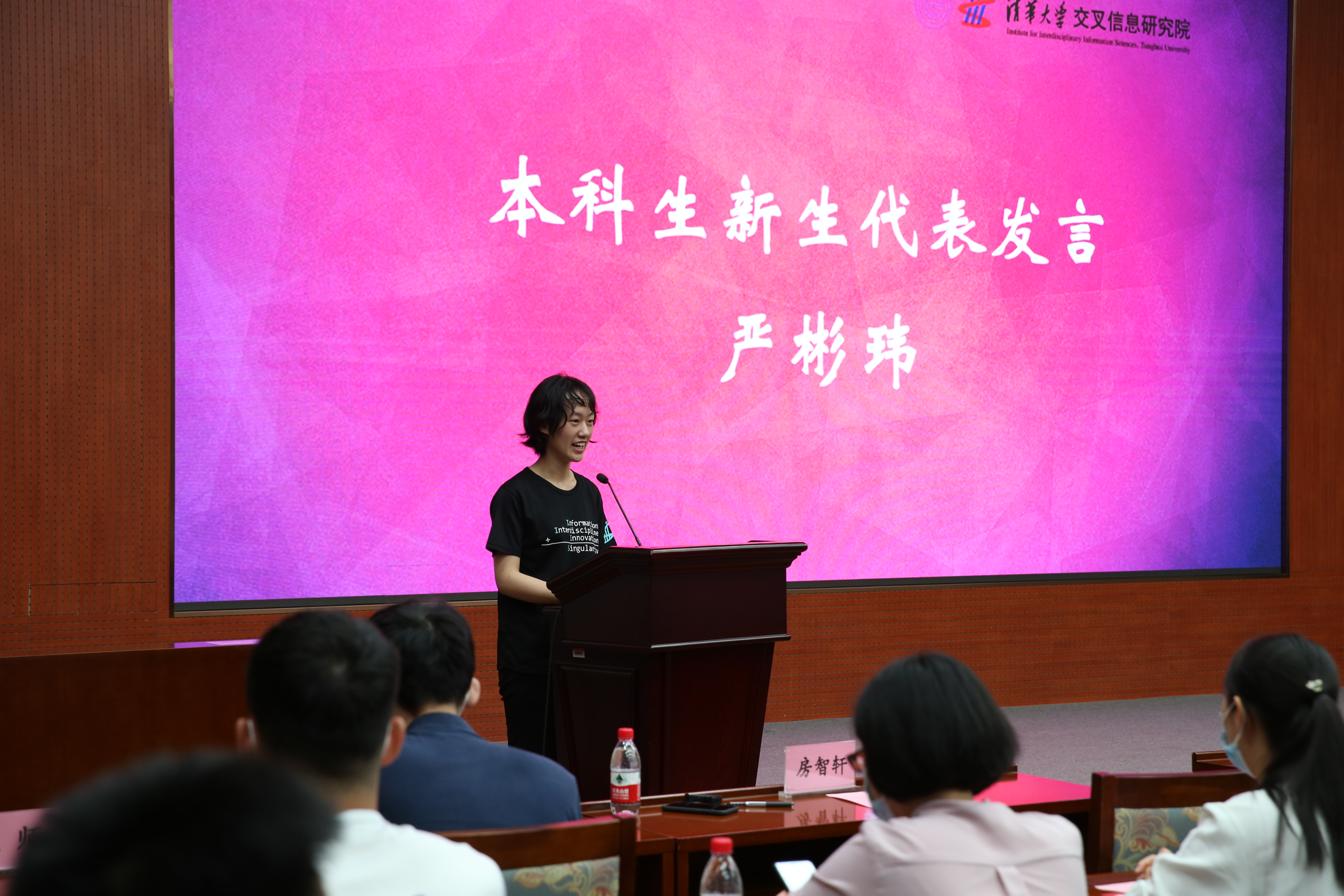 严彬玮代表全体本科生新生发言,感谢老师们和辅导员们对新生的关怀和陪伴。作为数学竞赛生,严彬玮交流了自己对于数学和基础理论研究的热爱。她表示非常幸运能进入交叉信息院探索科学研究的奇崛风景,将不忘个人命运和国家命运的结合,在自身奋斗的同时为社会、祖国,乃是全人类做出自己的贡献。