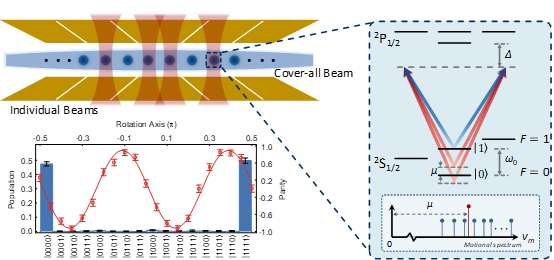 本研究中,金奇奂组在实验系统中对一种基于离子阱系统的全局纠缠门实现方案进行了演示与性能测试。离子阱系统作为实现大规模通用量子计算最具潜力的系统之一,具有最长的量子比特相干时间,能够执行高保真度的量子态测量与量子门操作。通过在单个势阱中囚禁多个离子,量子比特数可以扩展至数十至上百个,而基于此的小规模可编程量子计算机也在近日实现。离子阱量子计算系统利用激光驱动下量子比特与离子链联合振动模式的耦合实现比特间的纠缠,具有天然的全连接特性(即任意两个量子比特间都存在可控的相互作用)。因此任意比特间的量子纠缠仅需要单发操作(single shot)即可实现。这种全连接优势也使得全局纠缠门的实验实现成为可能。本研究所提出方案的关键在于优化与调制激光脉冲的强度和相位,以均匀地驱动所有量子比特间的相互作用。
