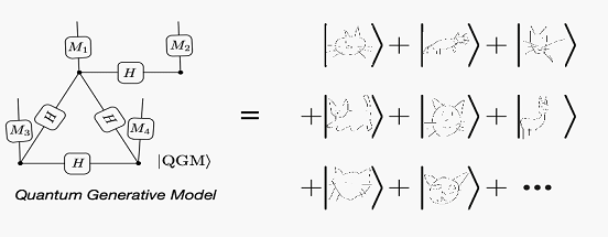 段路明、郜勋等首次提出了一种基于优化多体量子纠缠态的量子生成模型,并证明了该量子生成模型在学习能力与预测能力方面都存在指数加速。量子生成模型中,经典图中表示概率的参数由正实数扩大至复数域,这种新的量子图模型所需的参数个数相比于经典图模型(包括贝叶斯网络、马尔科夫随机场、玻尔兹曼机、深度信念网络等)有指数量级的减少,这对于生成模型来说,在空间和时间的效率上都是巨大的优势。段路明研究组提出了能实际有效利用这种新型图模型的启发式量子机器学习算法。此算法将生成模型的推断和训练问题,转化成量子多体哈密顿量的基态制备问题,并由此可以证明量子算法的指数加速。