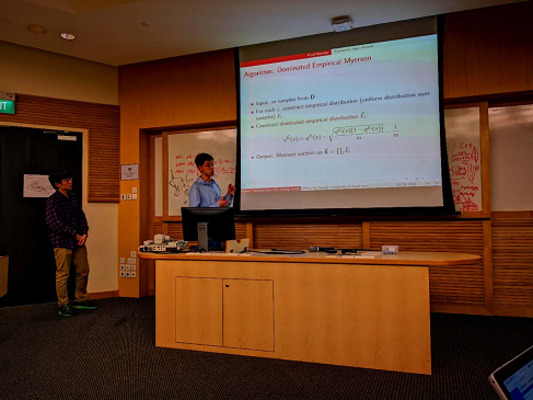 冬令营最后一天下午安排了学生展示环节。各组学生上台进行项目展示,探讨与计算机及计算机理论各个方面自己调研或研究的成果。六个小组分别在自动驾驶、优化问题、Ulam Game复杂度、最优拍卖等多个领域做了生动的报告。贝小辉、段然、曾坚阳等教授也针对其中的一些问题提出讨论,并在最后鼓励同学们再接再厉,不断取得新的进展。