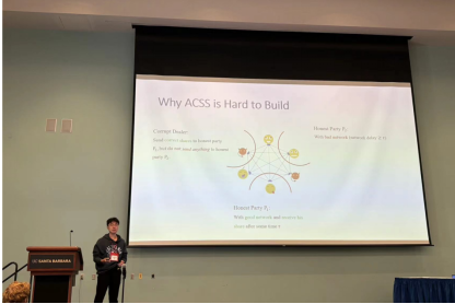 From the technical side, the main difficulty in the asynchronous setting is to achieve liveness, which requires the protocol to terminate eventually. The reason behind this difficulty is that a party cannot distinguish a delayed message due to the network latency from a corrupted party not sending the message. To achieve liveness, a party needs to proceed after he receives enough number of messages (which is usually equal to the number of honest parties). On the other hand, the messages that are not delivered may come from honest parties while among the received messages, some of them are from corrupted parties. As a result, the number of corrupted parties that can be tolerated in the asynchronous setting is smaller than that in the synchronous setting. And this issue also makes the design of secure multiparty computation protocols in the asynchronous setting much more difficult than that in the synchronous setting. To overcome this difficulty, Yifan Song’s team proposed two efficient solutions but neither of these two solutions guarantees termination. The first solution terminates only if a sufficient number of corrupted parties participate in the protocol. The second solution terminates only if a bounded number of corrupted parties participate. By a careful combination of these two protocols, it is ensured that a party can participate in the second protocol only if he participates the first protocol. In this way, at least one of these two protocols will eventually terminate.