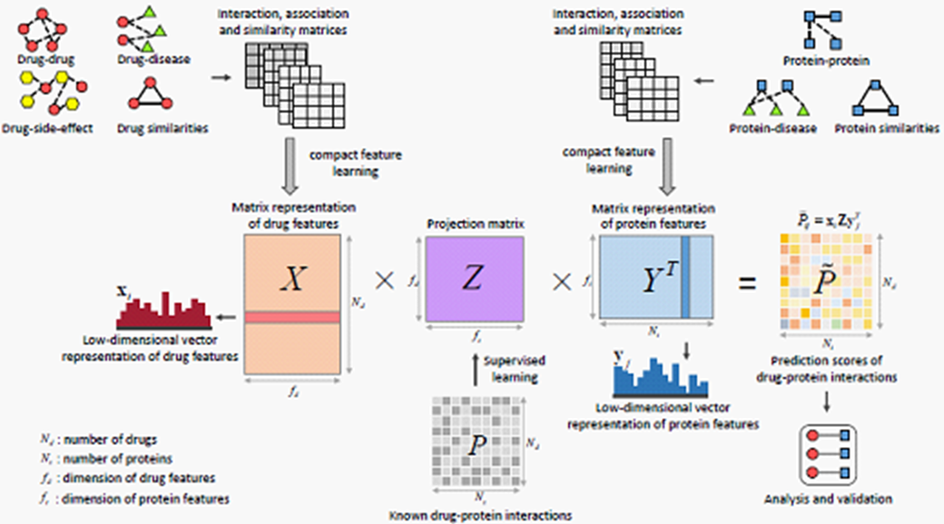 Prediction of drug-target interaction is a crucial step of drug discovery and drug repositioning. Large-scale genomic, chemical and pharmacological data provide new opportunities for drug-target interaction prediction. However, systematic integration of these heterogeneous datasets remains a challenge. Luo’s algorithm, called DTINet, employs a new machine learning approach to integrate these heterogeneous networks. The algorithm represents each drug and gene by compact patterns to remove the background noise of biological data and reveal the topological properties of drugs and genes, which is essential for improving the prediction performance. DTINet was found to outperform several state-of-the-art prediction methods. Furthermore, most of the novel drug-target interactions predicted by DTINet can be supported by known evidence in the literature. In addition, Zeng’s group collaborated with Prof. Ligong Chen’s Lab in the School of Pharmaceutical Science at Tsinghua University to experimentally validate those drug-target interactions that were rarely reported in previous studies. The experimental assays validated the interactions predicted by DTINet between three drugs and two proteins (PTGS1 and PTGS2) and demonstrated new potential applications of these drugs in preventing inflammatory diseases, which provides new insights into drug repositioning.
