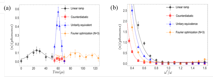 Figure 2Experiment results. (a) The nonadiabatic excitation in the instantaneous basis of different shortcut methods. Only the counterdiabatic driving realizes the adiabatic following all the time. (b) Robustness tests. We assume the trap frequency drifts to a wrong value and measure the final excitation of different shortcuts designed with the original value. The result shows the counterdiabatic driving is the best result.