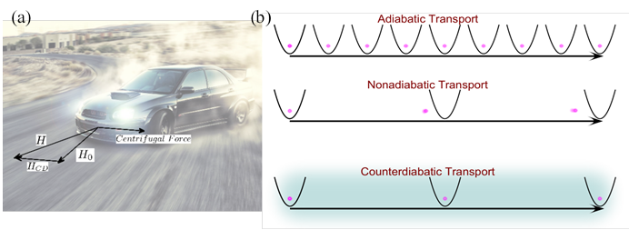 Figure 1(a) Classical analogy of the counter-diabatic driving (HCD) to move the car to the desired direction (H0). (b) The STA protocol without any speed limit by including counter-diabatic driving.