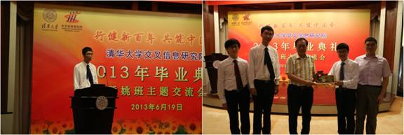 In 2013 Graduation Ceremony, IIIS excellent graduates, Yao Award winners and outstanding student leaders received public recognition. Zhihao Jia from Yao Class 90 and Bangsheng Tang from Yao Class 40 shared their experience at Yao Class and made their resolution to devote passion and endeavor to their future life.