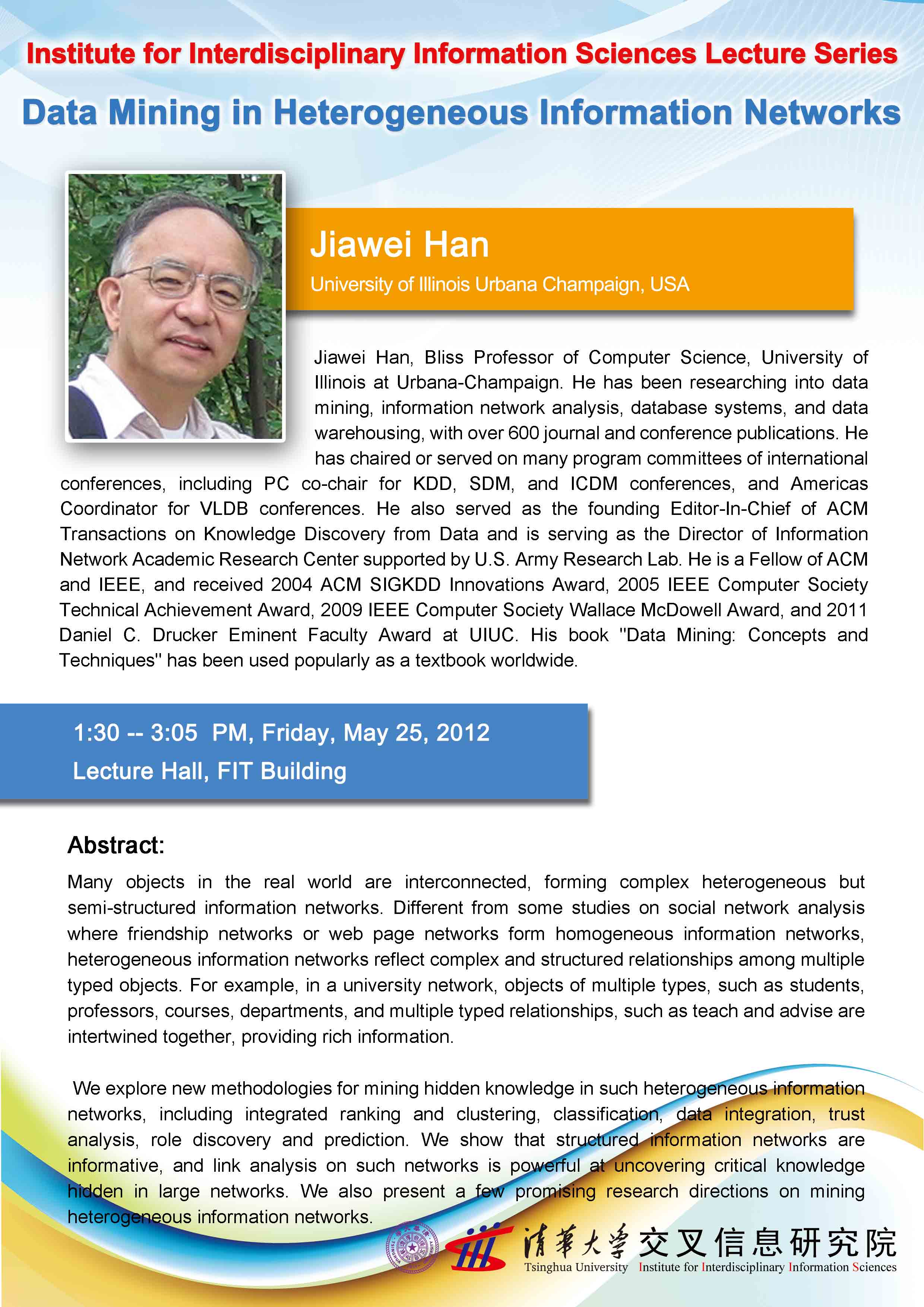 演讲人 <a href='//www.cs.uiuc.edu/~hanj/' target='_blank'>Jiawei Han</a> University of Illinois Urbana Champaign, USA 时间 2012-05-25 13:30-2012-05-25 15:05