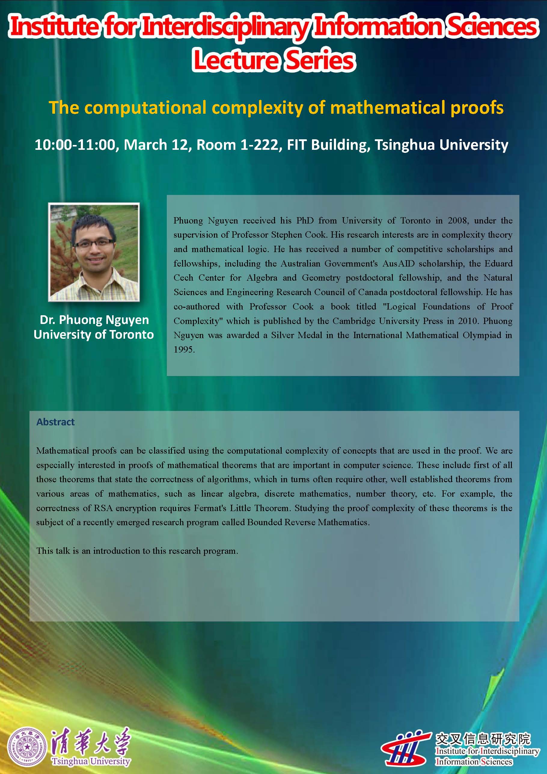 Phuong Nguyen received his PhD from University of Toronto in 2008, under the supervision of Professor Stephen Cook. His research interests are in complexity theory and mathematical logic. He has received a number of competitive scholarships and fellowships, including the Australian Government's AusAID scholarship, the Eduard Cech Center for Algebra and Geometry postdoctoral fellowship, and the Natural Sciences and Engineering Research Council of Canada postdoctoral fellowship. He has co-authored with Professor Cook a book titled "Logical Foundations of Proof Complexity" which is published by the Cambridge University Press in 2010. Phuong Nguyen was awarded a Silver Medal in the International Mathematical Olympiad in 1995.