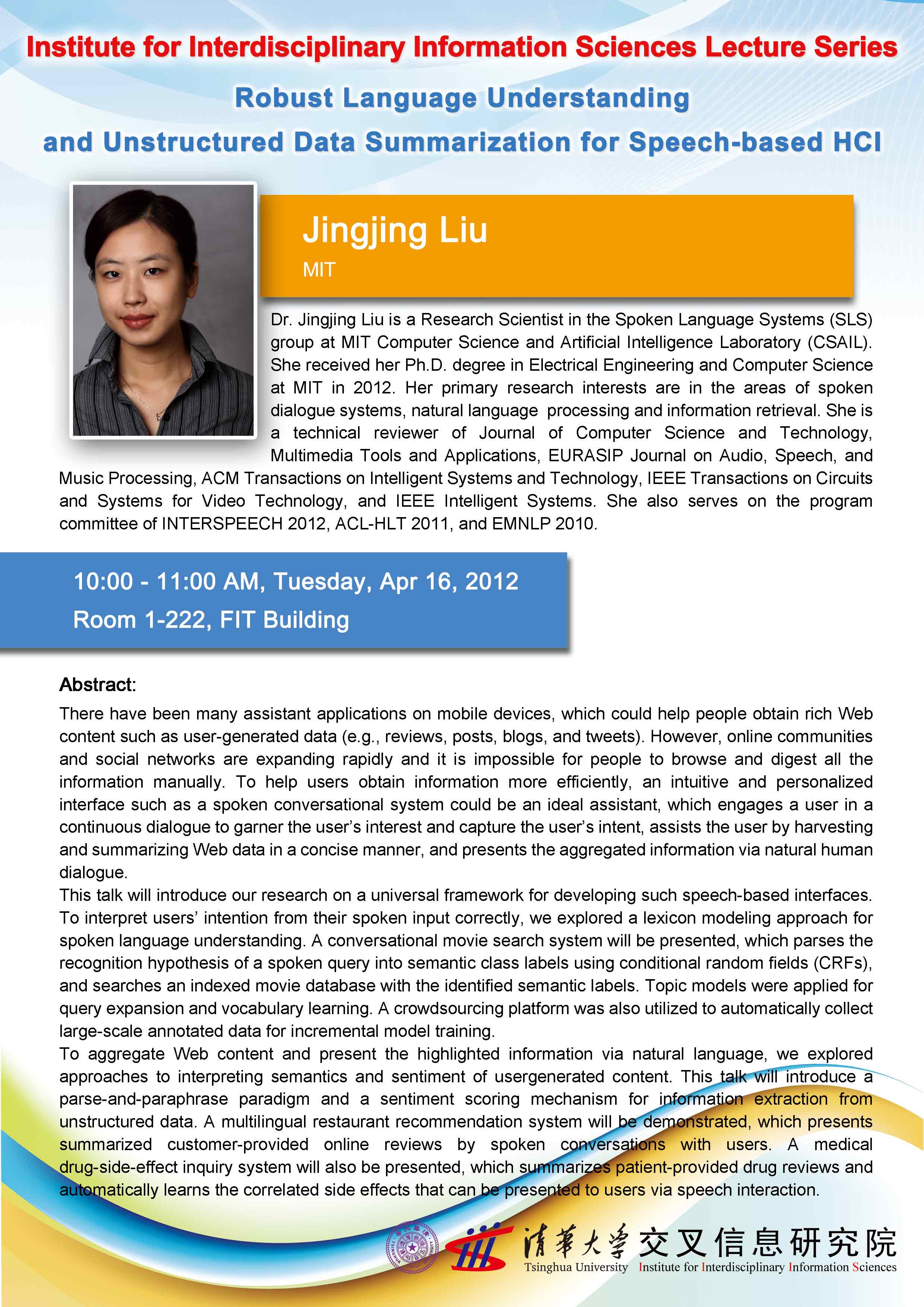Dr. Jingjing Liu is a Research Scientist in the Spoken Language Systems (SLS) group at MIT Computer Science and Artificial Intelligence Laboratory (CSAIL). She received her Ph.D. degree in Electrical Engineering and Computer Science at MIT in 2012. Her primary research interests are in the areas of spoken dialogue systems, natural language processing and information retrieval. She is a technical reviewer of Journal of Computer Science and Technology, Multimedia Tools and Applications, EURASIP Journal on Audio, Speech, and Music Processing, ACM Transactions on Intelligent Systems and Technology, IEEE Transactions on Circuits and Systems for Video Technology, and IEEE Intelligent Systems. She also serves on the program committee of INTERSPEECH 2012, ACL-HLT 2011, and EMNLP 2010.