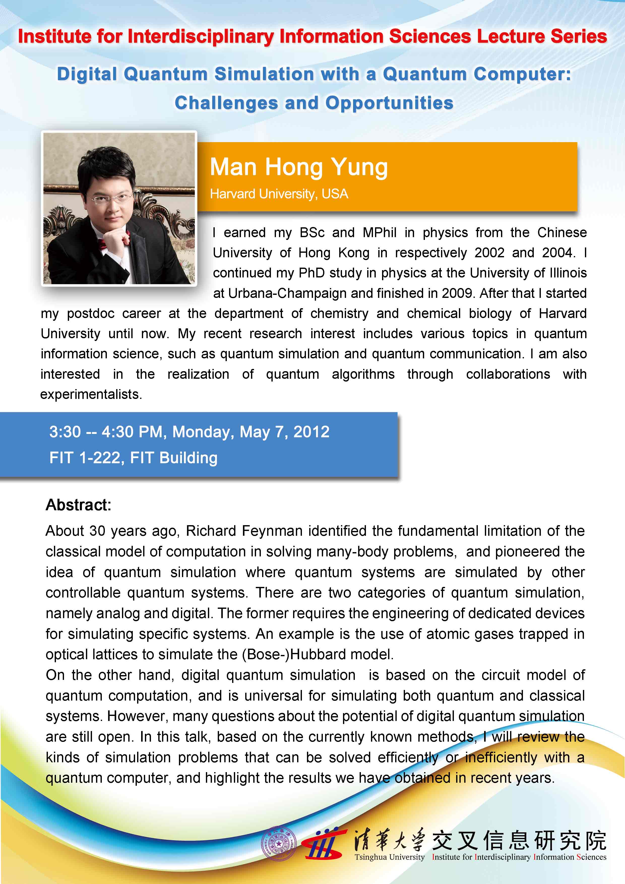 I earned my BSc and MPhil in physics from the Chinese University of Hong Kong in respectively 2002 and 2004. I continued my PhD study in physics at the University of Illinois at Urbana-Champaign and finished in 2009. After that I started my postdoc career at the department of chemistry and chemical biology of Harvard University until now. My recent research interest includes various topics in quantum information science, such as quantum simulation and quantum communication. I am also interested in the realization of quantum algorithms through collaborations with experimentalists.