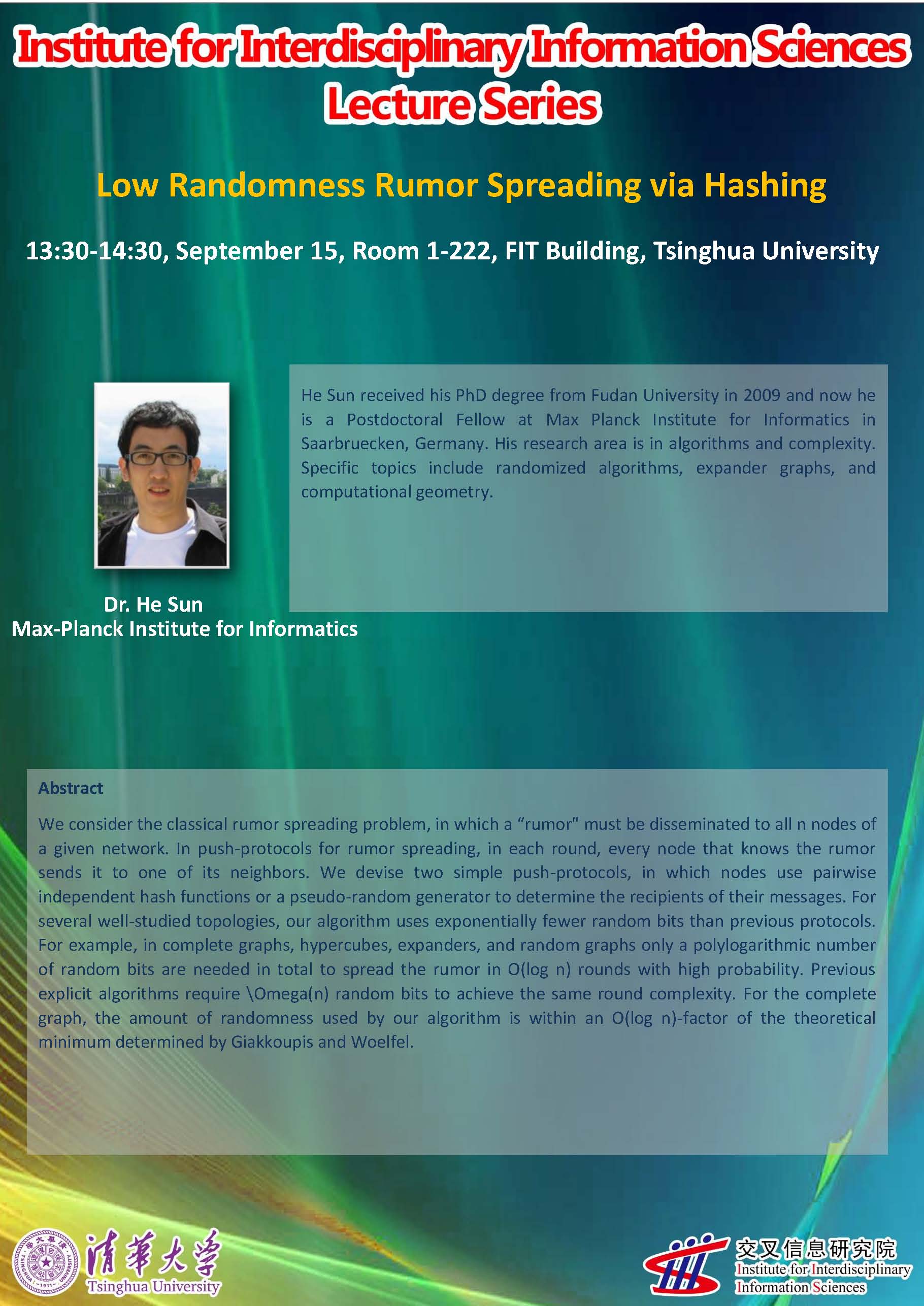 He Sun received his PhD degree from Fudan University in 2009 and now he is a Postdoctoral Fellow at Max Planck Institute for Informatics in Saarbruecken, Germany. His research area is in algorithms and complexity. Specific topics include randomized algorithms, expander graphs, and computational geometry.