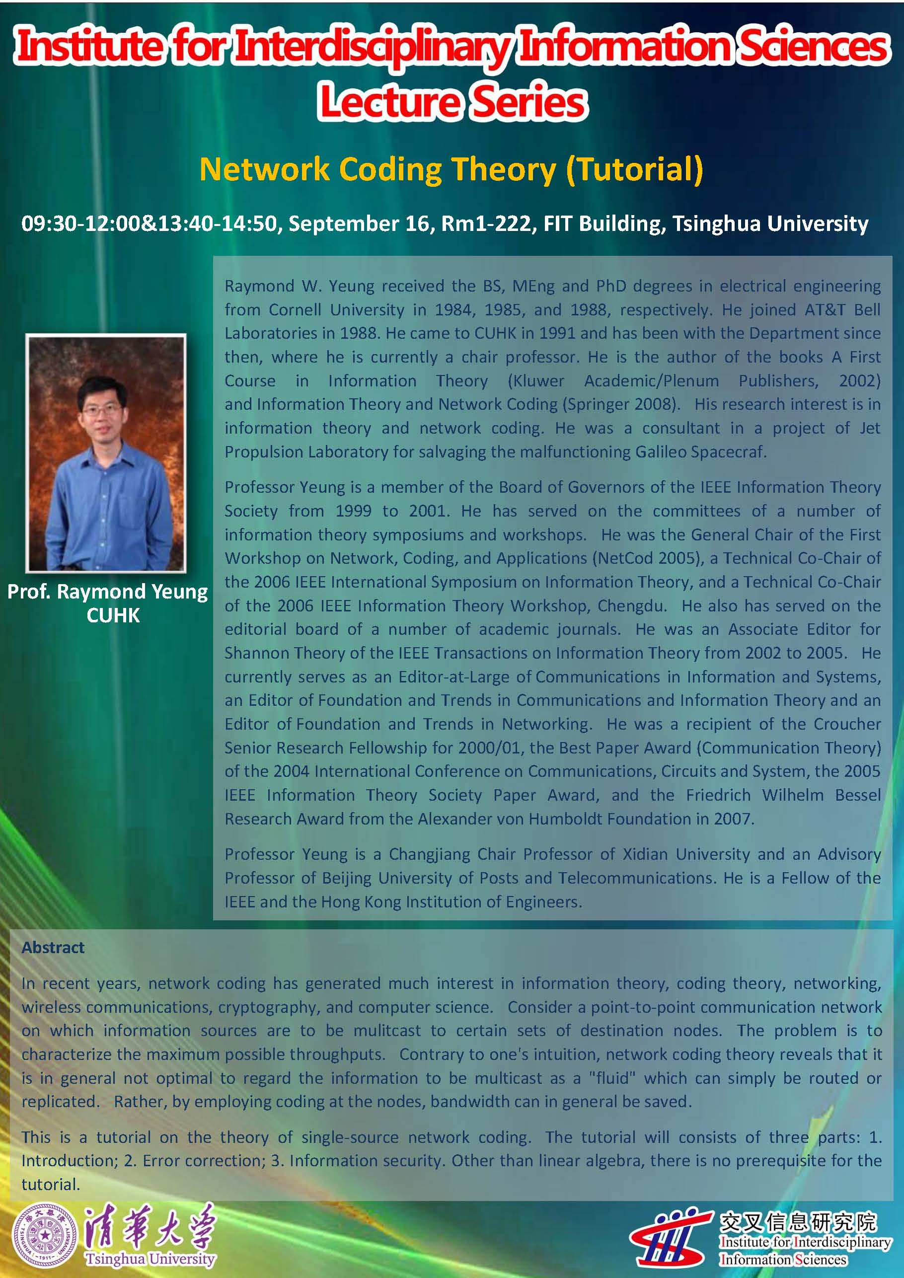 演讲人 Raymond Yeung CUHK 时间 2011-09-16 09:30-2011-09-16 14:50