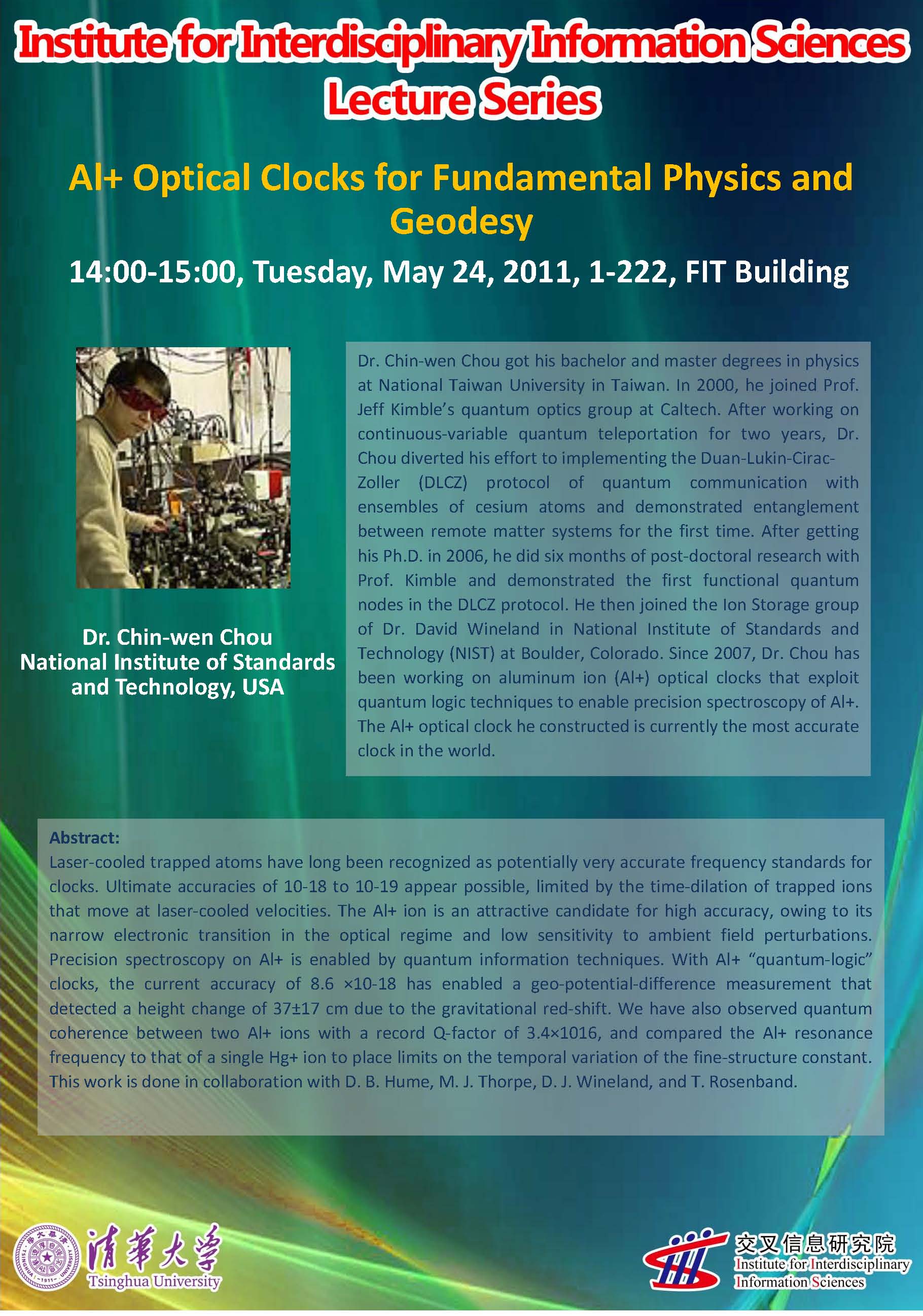 Dr. Chin‐wen Chou got his bachelor and master degrees in physics at National Taiwan University in Taiwan. In 2000, he joined Prof. Jeff Kimble’s quantum optics group at Caltech. After working on continuous‐variable quantum teleportation for two years, Dr. Chou diverted his effort to implementing the Duan‐Lukin‐Cirac‐Zoller (DLCZ) protocol of quantum communication with ensembles of cesium atoms and demonstrated entanglement between remote matter systems for the first time. After getting his Ph.D. in 2006, he did six months of post‐doctoral research with Prof. Kimble and demonstrated the first functional quantum nodes in the DLCZ protocol. He then joined the Ion Storage group of Dr. David Wineland in National Institute of Standards and Technology (NIST) at Boulder, Colorado. Since 2007, Dr. Chou has been working on aluminum ion (Al+) optical clocks that exploit quantum logic techniques to enable precision spectroscopy of Al+. The Al+ optical clock he constructed is currently the most accurate clock in the world.