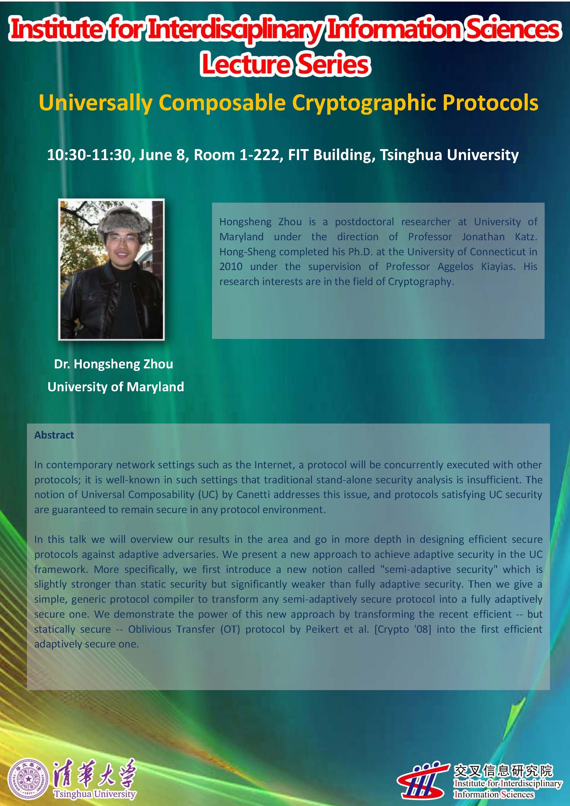 Hong-Sheng Zhou is a postdoctoral researcher at University of Maryland under the direction of Professor Jonathan Katz. Hong-Sheng completed his Ph.D. at the University of Connecticut in 2010 under the supervision of Professor Aggelos Kiayias. His research interests are in the field of Cryptography.