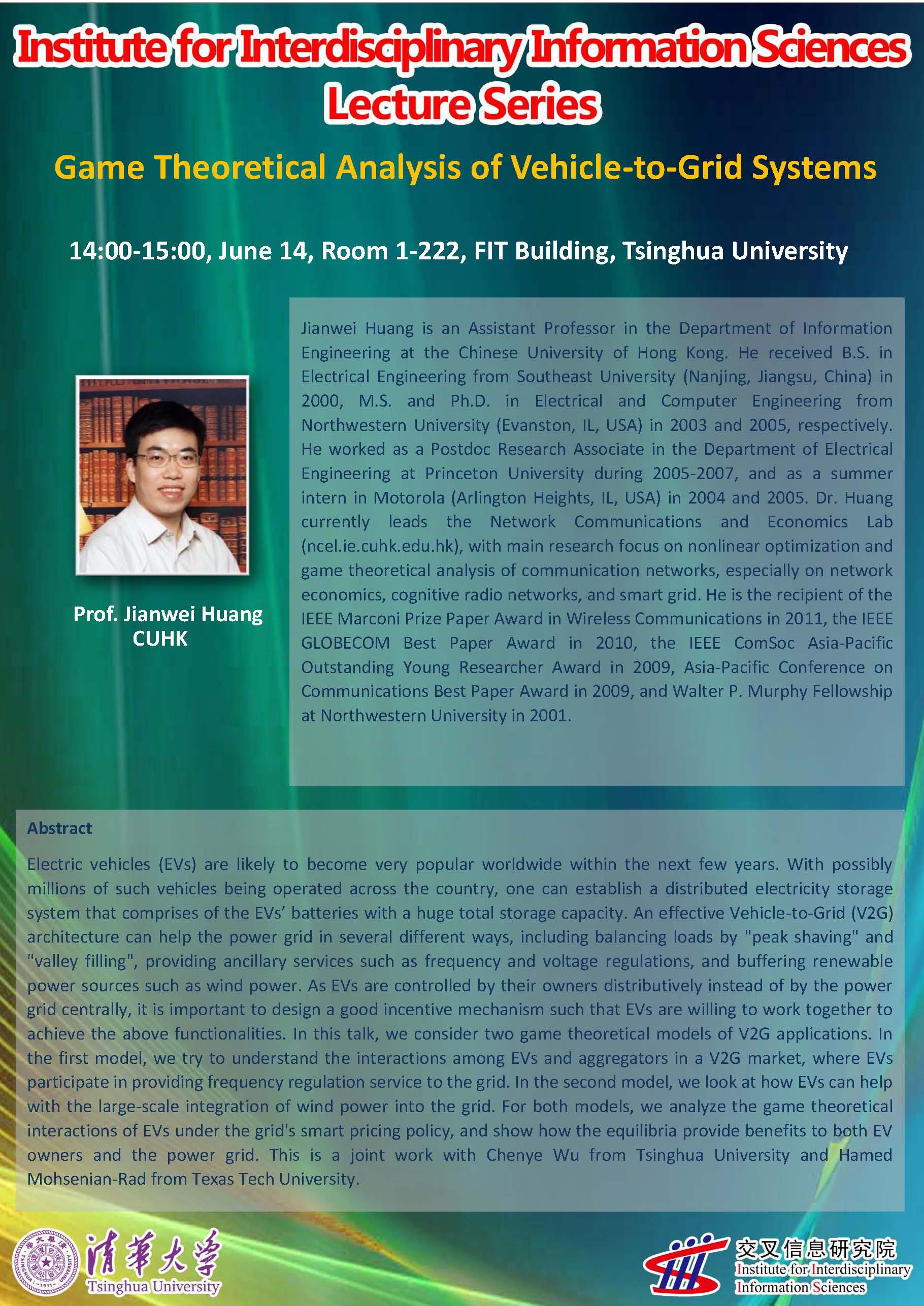 Electric vehicles (EVs) are likely to become very popular worldwide within the next few years. With possibly millions of such vehicles being operated across the country, one can establish a distributed electricity storage system that comprises of the EVs’ batteries with a huge total storage capacity. An effective Vehicle-to-Grid (V2G) architecture can help the power grid in several different ways, including balancing loads by "peak shaving" and "valley filling", providing ancillary services such as frequency and voltage regulations, and buffering renewable power sources such as wind power. As EVs are controlled by their owners distributively instead of by the power grid centrally, it is important to design a good incentive mechanism such that EVs are willing to work together to achieve the above functionalities. In this talk, we consider two game theoretical models of V2G applications. In the first model, we try to understand the interactions among EVs and aggregators in a V2G market, where EVs participate in providing frequency regulation service to the grid. In the second model, we look at how EVs can help with the large-scale integration of wind power into the grid. For both models, we analyze the game theoretical interactions of EVs under the grid's smart pricing policy, and show how the equilibria provide benefits to both EV owners and the power grid. This is a joint work with Chenye Wu from Tsinghua University and Hamed Mohsenian-Rad from Texas Tech University.