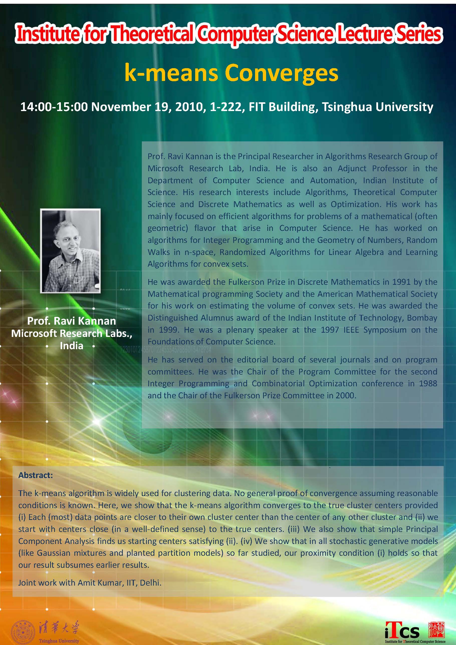 演讲人 <a href='//research.microsoft.com/en-us/um/people/kannan/' target='_blank'>Ravi Kannan</a> Microsoft Research Labs., India 时间 2010-11-19 14:00-2010-11-19 15:00