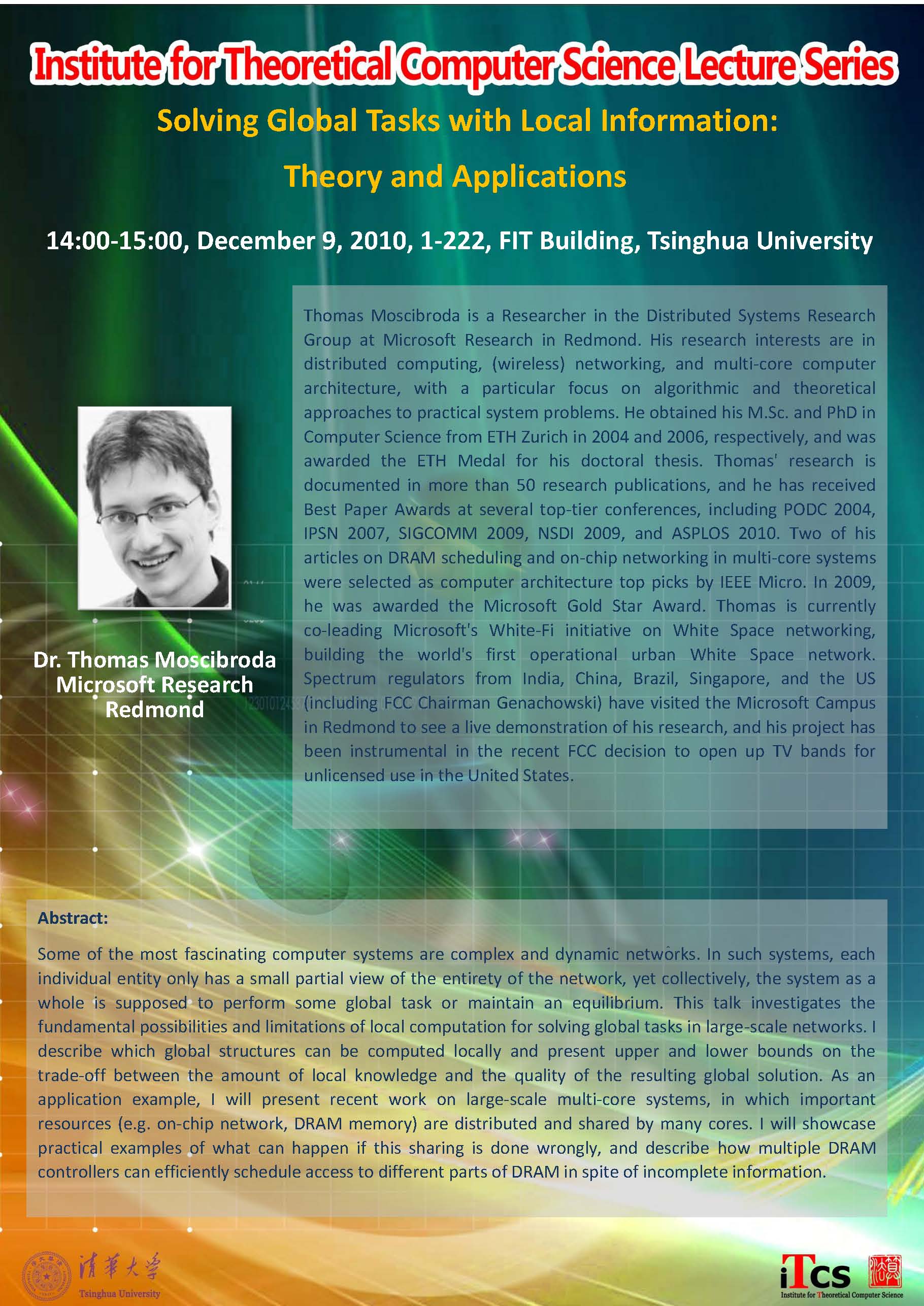 演讲人 <a href='//research.microsoft.com/en-us/um/people/moscitho/' target='_blank'>Thomas Moscibroda</a> Microsoft Research Redmond 时间 2010-12-09 14:00-2010-12-09 15:00