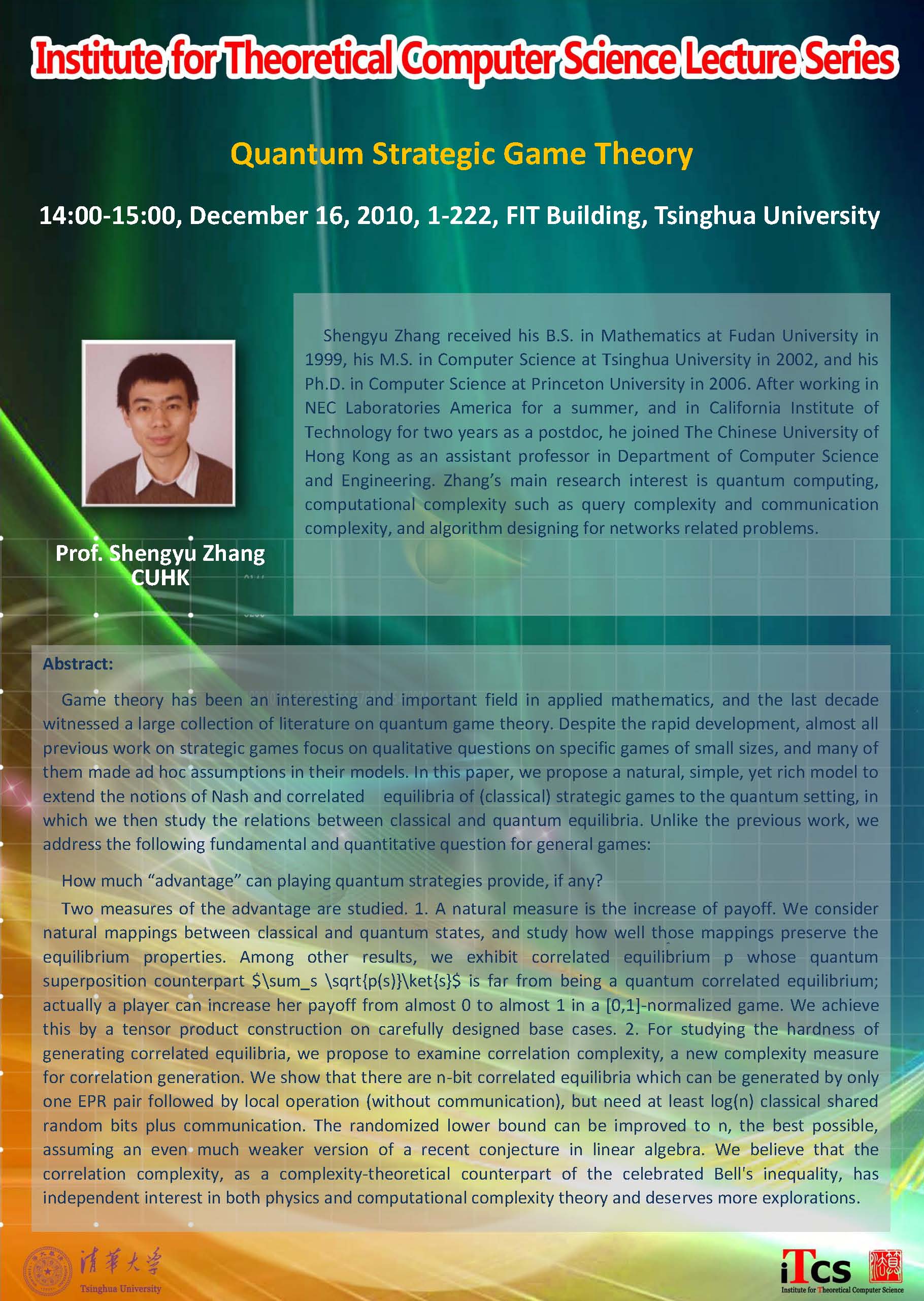Shengyu Zhang received his B.S. in Mathematics at Fudan University in 1999, his M.S. in Computer Science at Tsinghua University in 2002, and his Ph.D. in Computer Science at Princeton University in 2006. After working in NEC Laboratories America for a summer, and in California Institute of Technology for two years as a postdoc, he joined The Chinese University of Hong Kong as an assistant professor in Department of Computer Science and Engineering. Zhang’s main research interest is quantum computing, computational complexity such as query complexity and communication complexity, and algorithm designing for networks related problems.