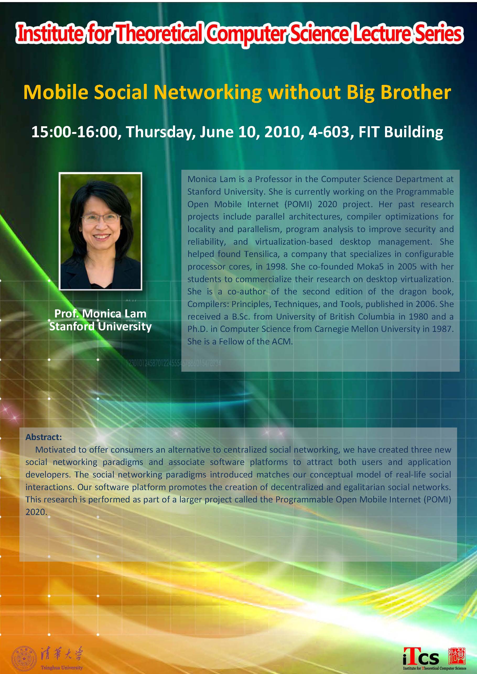 Monica Lam is a Professor in the Computer Science Department at Stanford University. She is currently working on the Programmable Open Mobile Internet (POMI) 2020 project. Her past research projects include parallel architectures, compiler optimizations for locality and parallelism, program analysis to improve security and reliability, and virtualization-based desktop management. She helped found Tensilica, a company that specializes in configurable processor cores, in 1998. She co-founded Moka5 in 2005 with her students to commercialize their research on desktop virtualization. She is a co-author of the second edition of the dragon book, Compilers: Principles, Techniques, and Tools, published in 2006. She received a B.Sc. from University of British Columbia in 1980 and a Ph.D. in Computer Science from Carnegie Mellon University in 1987. She is a Fellow of the ACM.