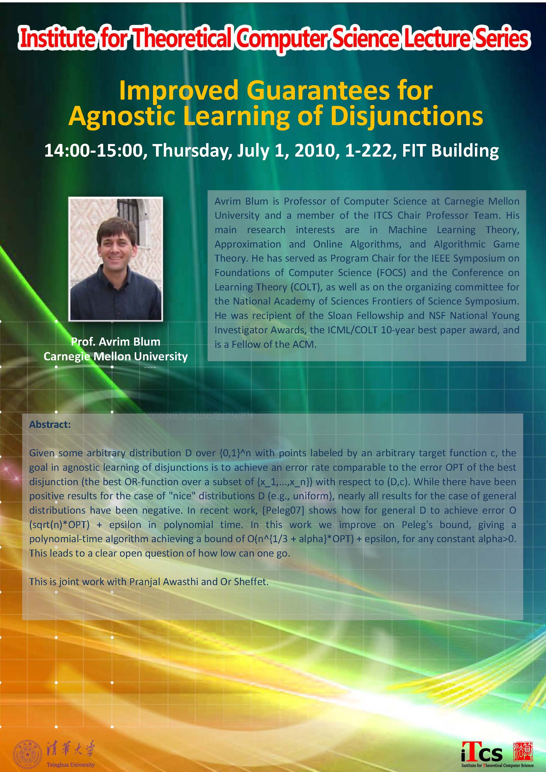 演讲人 <a href='//www.cs.cmu.edu/~avrim/' target='_blank'>Avrim Blum</a> Carnegie Mellon University 时间 2010-07-01 14:00-2010-07-01 15:00