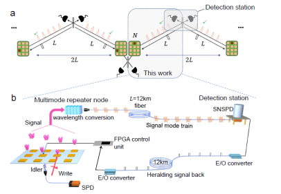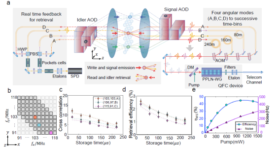 图1:多模复用的量子中继架构。通过依次激发70个独立可寻址的空间阵列存储器单元,产生280个时分(time-bin)光子模式。光子模式通过波长转换装置转换为通讯波段,在经过12公里光纤传输后在探测器上被探测。