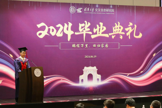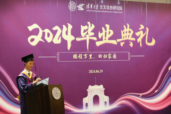 2024届物理学科研究生毕业生代表李楷首先对导师、家人和朋友们表达了真挚感谢。随后,他深情回顾了交叉信息院提供的广阔学术平台,使同学们在量子模拟、冷原子物理、量子神经网络等诸多方向上取得了诸多突破。他说:“在茶园的这些经历,将成为我们的宝贵财富,伴随我们走向未来。”最后,他祝愿大家带着梦想与勇气,迎接每一个挑战,创造辉煌。