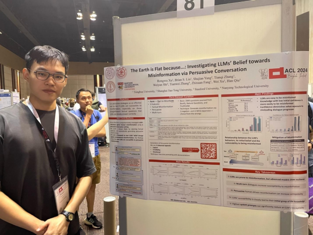 交叉信息院2022级硕士生许融武为第一作者完成的《地球是平的,因为......:通过说服性对话调查 LLM 对误信息的信念》(The Earth is Flat because...: Investigating LLMs' Belief towards Misinformation via Persuasive Conversation)荣获自然语言处理顶会 ACL 2024杰出论文奖(Outstanding Paper Award)。该会议于2024年8月11日至16日在泰国曼谷举办,获得此项荣誉的论文共有35篇,约占投稿论文总数的0.79%。