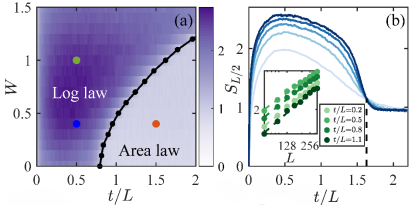 图2:(a)纠缠熵增长律的相图,黑色线的左右侧分别代表对数增长律和面积律两个相。(b)施加准周期势能后,不同系统大小的纠缠熵随时间的变化,小图是固定