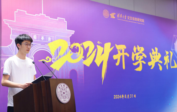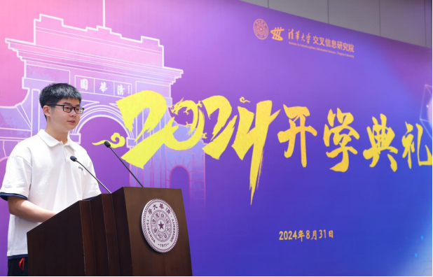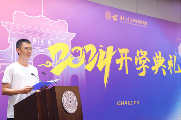 交叉信息院研究生会主席许融武代表在校生欢迎新同学的到来。他基于在茶园成长的经历,从选择更艰难的道路、选择更长远的道路、选择对社会国家有益的道路三个方面分享了自己的科研感悟,并与2024级新生共勉,为建成教育强国,科技强国作出贡献。