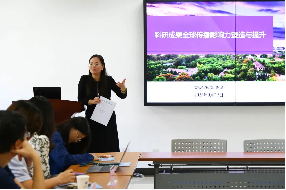 分学科全球传播试点计划后所取得的进展和成果。随后,陈老师以“科研成果全球传播影响力塑造与提升”为题,从全球传播的背景意义、内涵职能、工作策略三个方面分享了院校全球传播能力建设的目标和方案,并聚焦科学传播从理论到实践的实操策略。她从回顾党中央对全球传播工作的系列重要指示精神出发,介绍了熟女
