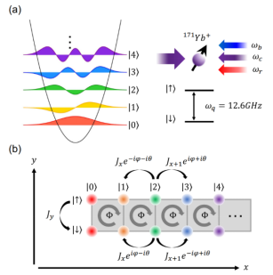 合成维度是量子模拟研究拓扑物态的重要手段,可用于研究实验室难以直接获得的高维材料性质,也可通过调节格点之间的跃迁振幅实现可控的人工磁场,模拟实验中难以直接达到的磁场强度。此前,在中性原子、光子学等系统中已通过内部能级和离散的频率、动量、角动量等模式实现过合成维度。本工作首次在离子阱系统,利用离子在空间振动的无穷维福克态(Fock state)实现合成维度,扩展了合成维度的实现方式和在离子阱系统的应用。