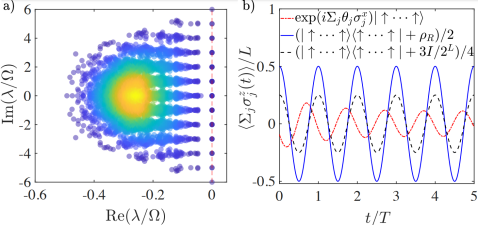 图2:以量子多体伤痕态为无耗散子空间的刘维尔超算符的能谱以及耗散动力学