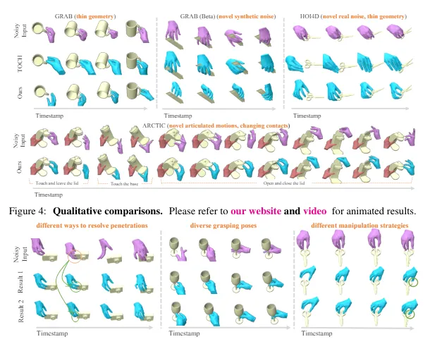 该研究组还提出了一套通用泛化的手物交互去噪算法GeneOH Diffusion,用于处理手-物交互(HOI)中的去噪问题。该方法通过创新的基于接触的HOI表示GeneOH和一个新的领域泛化去噪方案来解决复杂的交互噪声问题。GeneOH Diffusion在多个基准测试中展示了其优越的有效性和泛化能力,对各种下游应用也显示出了潜力。