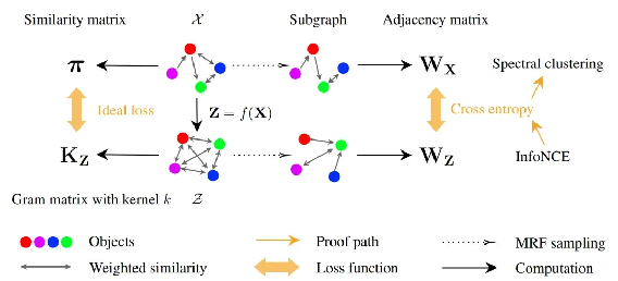 袁洋研究组提出了一种崭新的分析对比学习算法的视角,使用马尔科夫随机场作为分析工具,证明了SimCLR算法和在相似图上做某种谱聚类算法是严格等价的。该工作可以用来启发设计新的基于核函数的损失函数,在一些数据集上取得更好的结果,进一步支持了范畴论可以作为大模型的基础理论框架的学术观点。
