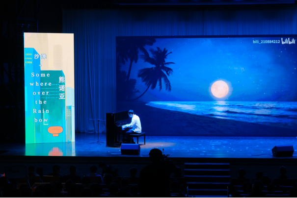 2020级本科生熊诺亚以略带爵士风格的钢琴弹唱《沙滩》+《somewhere over the rainbow》引领观众重归沉静,尽享在蔚蓝海水边、沙滩上漫步的清朗、宁静。