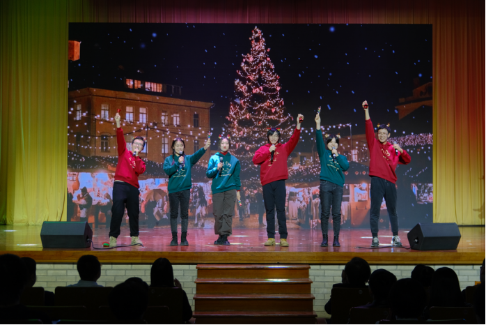 在计科23班主创的DV剧《智能探索实验室》之后,2022级博士生刘雨玚,2020级本科生张芮扬、袁樱,2022级本科生邓奕鹏、史钰申,2023级本科生蒋金辰、钱海天共同带来歌舞表演《Jingle Bells through the Ages》。在阵阵铃声、歌声中,听众共同感受笑声与欢乐。