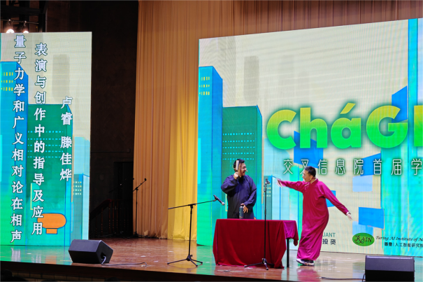 紧随其后的是2020届校友卢睿、2020级博士生滕佳烨表演的相声《量子力学和广义相对论在相声表演与创作中的指导及其应用》,幽默演绎了四维空间里的科学与艺术合体。