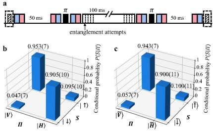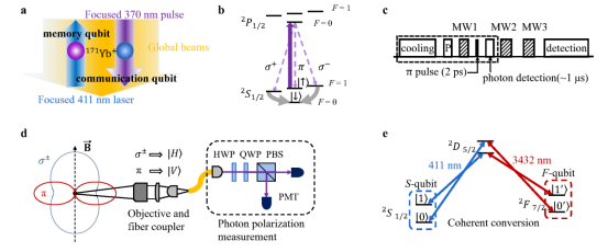 离子的两对超精细结构能级分别编码通讯比特和存储比特(S-比特和F-比特),并利用411 nm和3432 nm的双色窄线宽激光实现了两种量子比特之间微秒量级的相干转换。一方面,研究人员演示了利用S-比特在数百毫秒的时间尺度内生成离子-光子纠缠;另一方面,研究人员通过自旋回波方法延长F-比特的存储寿命,实现相干时间达到秒量级的存储量子比特。通过比较有无离子-光子纠缠生成操作时存储比特的保真度变化,研究人员证实了两种量子比特之间低于实验精度的串扰误差,从而实现了无串扰的量子网络节点。相较于之前采用不同种类离子的方案,该方案极大简化了实验系统,向着未来量子计算机和量子网络的模块化迈出了重要一步。
