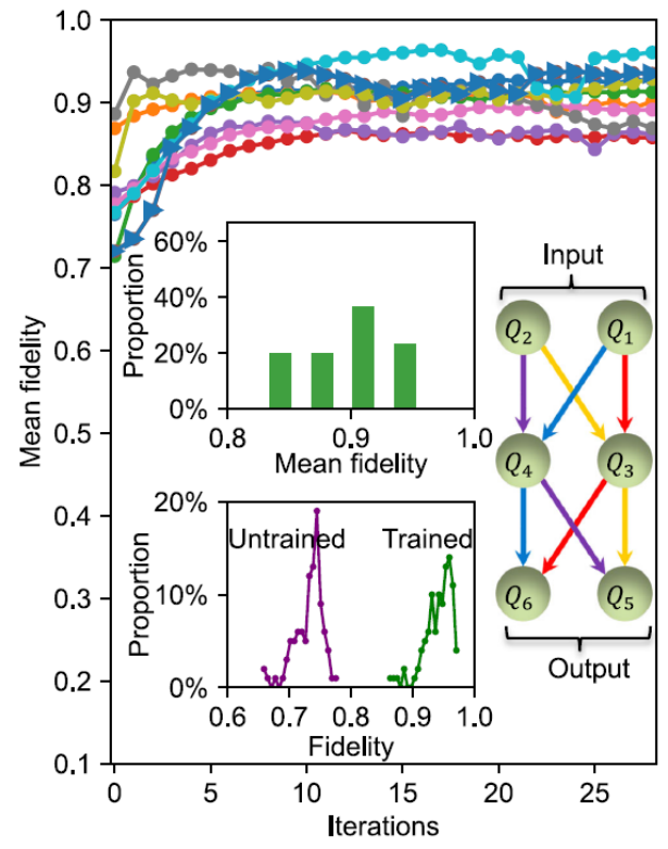 实验设计了深度为三层,每层宽度为两比特的6比特超导量子芯片,用于学习两比特量子通道。实验结果如图2所示。结果表明,在较短的迭代次数内,训练过程可以有效收敛,且平均保真度最高达到96%。在泛化测试中,训练后的量子神经网络对于43%的随机输入态,输出态与目标量子信道输出态的保真度超过95%。这些实验结果成功展示了深度量子神经网络的可训练性与泛化能力。当量子比特噪声水平进一步降低后,实验所用的训练方法可以直接扩展到具有更深层数和更大宽度的大规模量子网络上,从而进一步提升量子机器学习的实用价值。