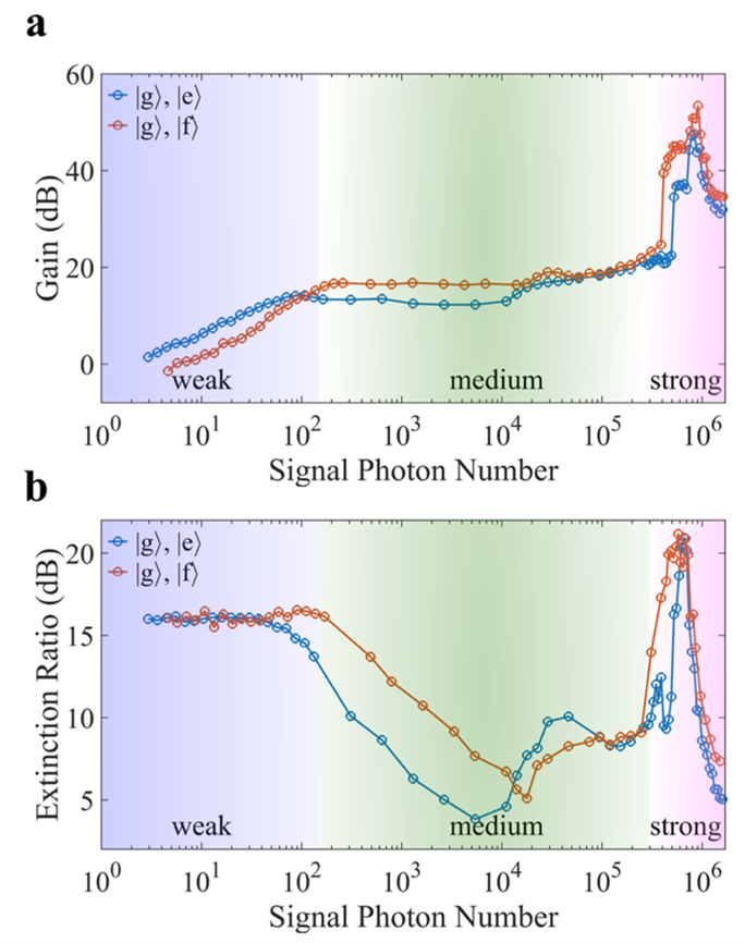 在此项工作中,研究人员利用超导量子电路实现了极高增益和开关比的微波单光子三极管。如图1a和b所示,他们采用一个超导量子比特和微波谐振腔的耦合系统作为三极管的栅极,在栅极入射的单光子可以改变超导量子比特的状态,进而改变与之耦合的另一个微波谐振腔(提供源极和漏极)的共振频率,从而能够对在源极入射的微波光子完成开关操作。在实验中,研究人员用微弱的相干态微波信号模拟单光子态用作栅极的控制信号,他们发现单个光子的确能够有效的控制三极管的开启和关断,实现对源极微波信号的开关操作。由于源极微波光子数可以很高,这也相当于实现了对栅极单光子信号的有效放大。研究人员发现,该三极管可以在一个很大的源极信号强度范围内正常工作,这相当于实现了一个增益极高的单光子放大过程。如图2a和b所示,即使当源极的入射光子数接近106个的时候,该三极管依然可以有超过20dB的开关比,同时实现约53.4dB(相当于2.19×105)的增益,比之前的工作提高了三个数量级。这项工作为基于微波光子的量子网络和量子信息处理技术奠定了重要的基础。