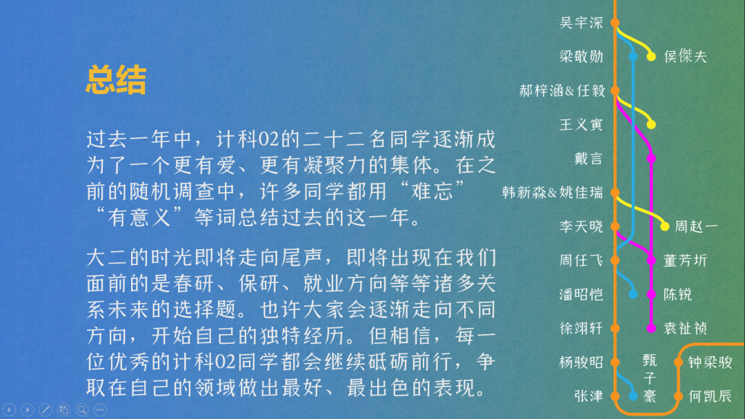 在计科02团支书吴宇深的展示中,他别出心裁地用同学们的故事将各方面的班团建设内容串联起来,随着展示的推进,最终画出一张串联起全体班级成员的Git版本图,并以其中蕴含的美好寓意结尾。展示中埋藏了不少趣事与彩蛋,展现了过去一年支部同学们的精彩故事。