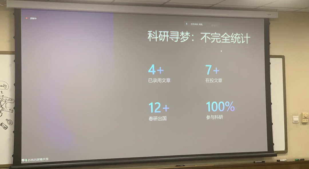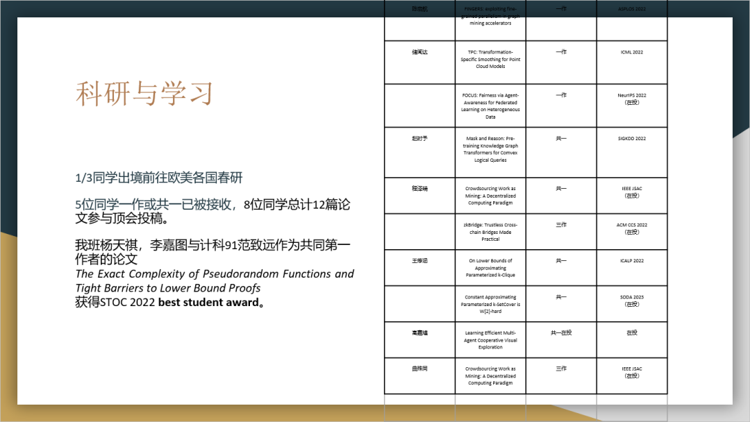 计科92班长赵时予同学正在境外春研,他以在线上的方式对其支部活动进行了展示。计科92的科研成绩斐然,该支部同学已有多篇已投和在投论文,并获STOC 2022最佳学生论文,充分体现了计科92支部浓厚的学术氛围。