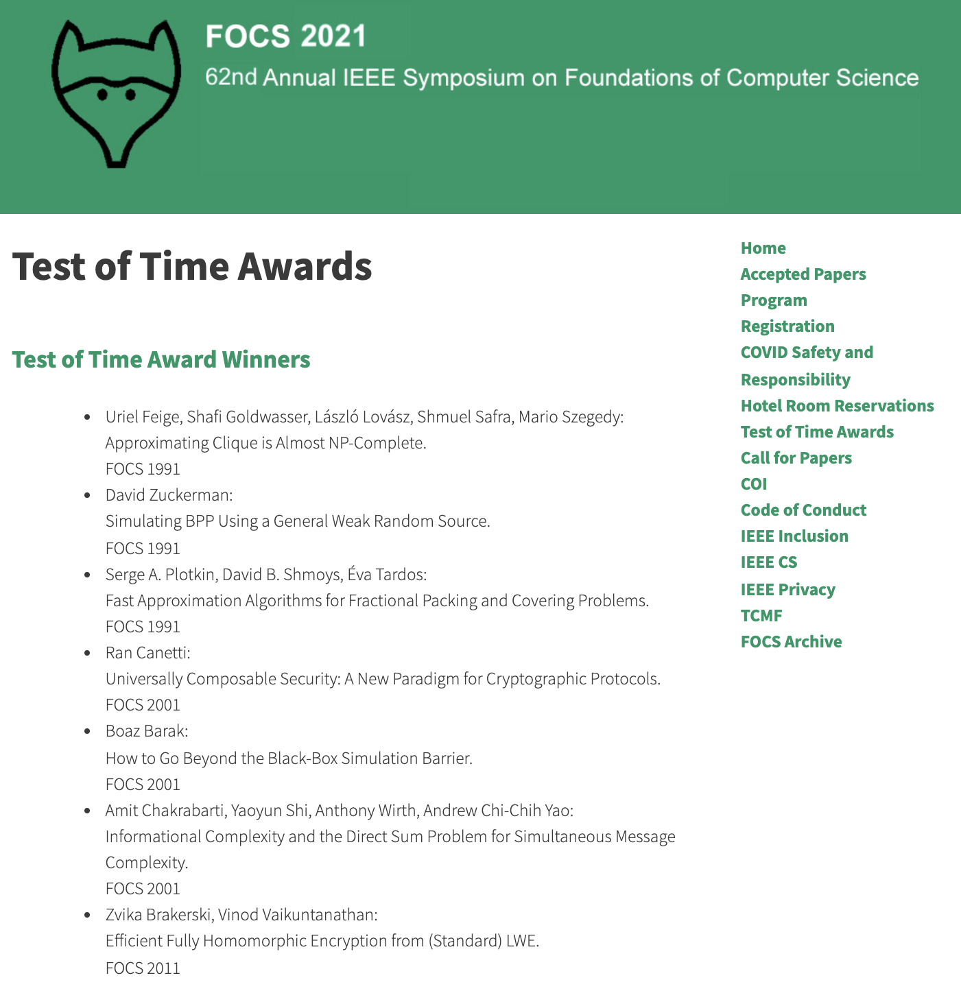 点击链接,查看官方新闻: //focs2021.cs.colorado.edu/test-of-time-awards/