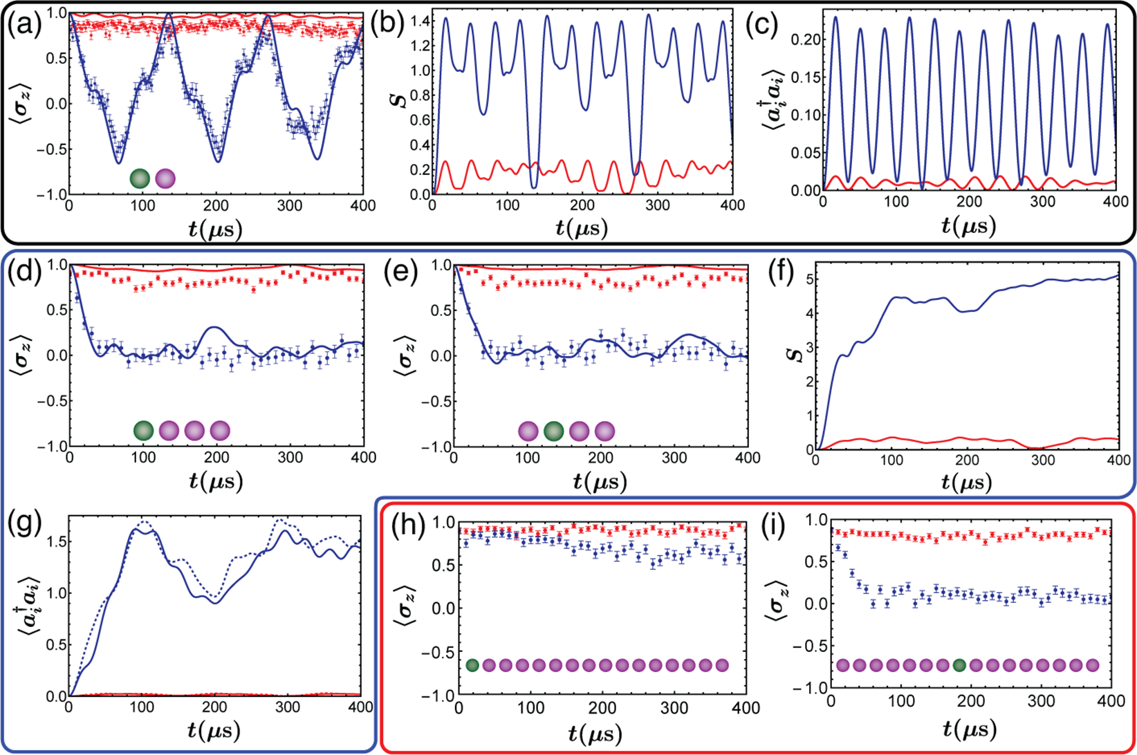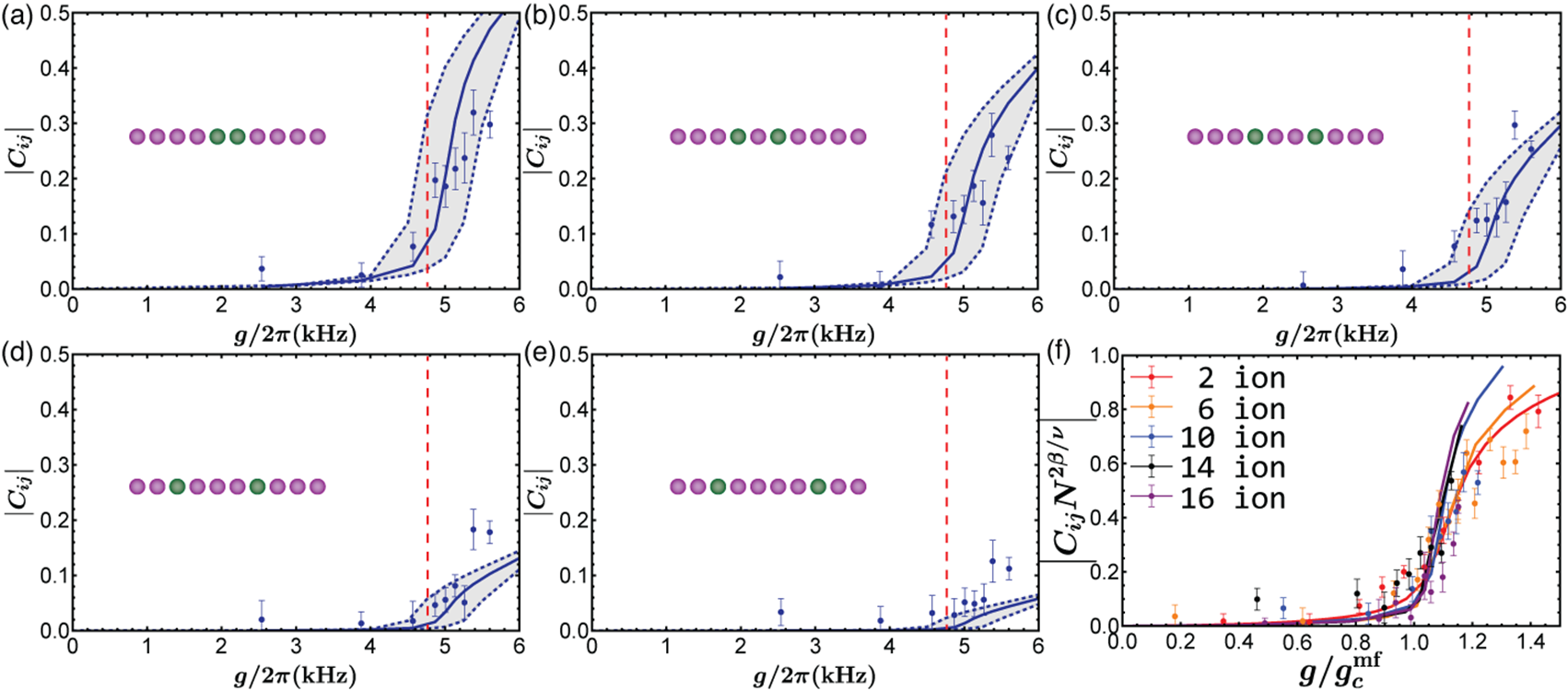 得益于离子阱量子模拟平台的高度可控性,研究人员实现了对拉比-哈伯德模型的可控量子模拟研究。研究人员通过对激光的精密操控实现了离子量子比特与 局域声子的相互作用,而离子阱系统中的库伦相互作用形成了不同离子间的局域声子交换项。在这项工作中,研究人员通过量子相变和量子动力学两个方面验证了拉比-哈伯德模型的成功实现。在量子相变方面,研究人员通过绝热演化实现了相干相和非相干相之间的转化,在此过程中通过测量空间自旋关联这一序参量,成功在不同规模的离子阵列中观测到量子相变现象,且与DMRG方法近似计算的结果相符。而在量子动力学方面,拉比-哈伯德模型包含了离子的自旋模式和空间振动模式的相互耦合,这显著增加了该系统有效的希尔伯特空间维度,使得经典模拟难度增加。研究人员在小规模体系(2离子、4离子)下观测到了符合经典模拟预期的量子动力学演化,与量子相变一同证明了本实验中拉比-哈伯德模型的成功实现。而在大规模体系(16离子)和强耦合参数区间,常用的经典近似方法将不再适用,实验系统的有效态空间维度高达257,相关的动力学过程已经难以通过经典计算机模拟计算。该实验展示了基于离子阱平台的量子多体模拟,将空间振动自由度引入量子模拟中,实现了经典计算机难以计算的问题规模,是通向未来大规模离子阱量子计算、量子模拟的重要一步。