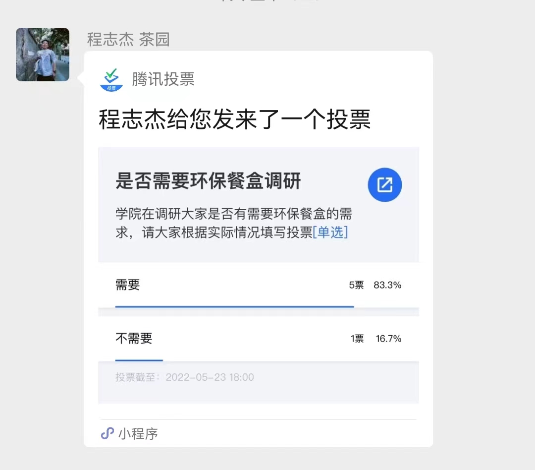 “学校停止堂食的决定能明显减少同学们在食堂逗留的时间,能有效避免交叉感染的几率,所以我们应该积极响应号召。为了方便同学们就餐以及减少一次性塑料餐盒的使用,我们调研了茶园同学们的环保餐盒套装的需求,将统一订购和发放餐盒套装,为疫情防控贡献力量。”交叉信息院研究生分会主席程志杰同学,主动发起团购环保餐盒,支持学校不堂食的防疫政策。